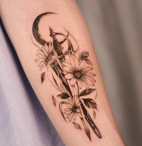 꽃과 함께 표현하면 분위기가 부드러워지고, 불꽃이나 해골이 들어가면 강한 무드가 살아나요.